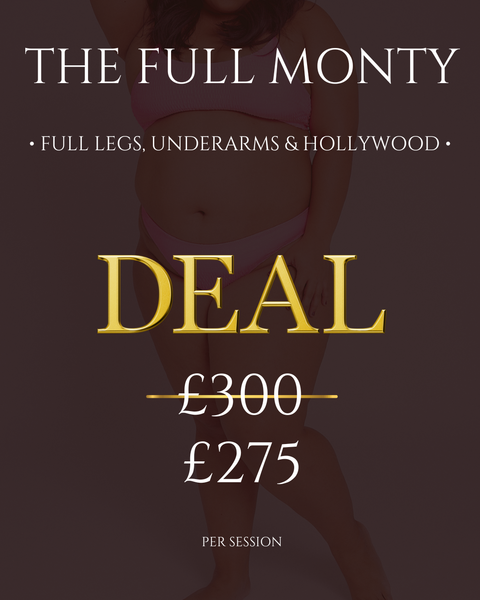 Full legs, underarms & full Hollywood. Worth £1800 when booked individually.